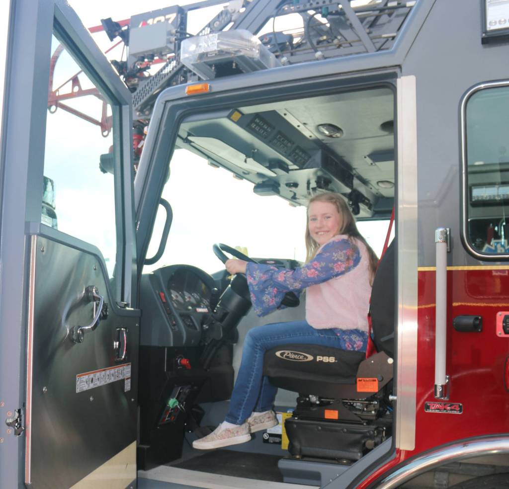 Ten-year-old Emerson Kapp sits in the new CES ladder truck at dedication open house.