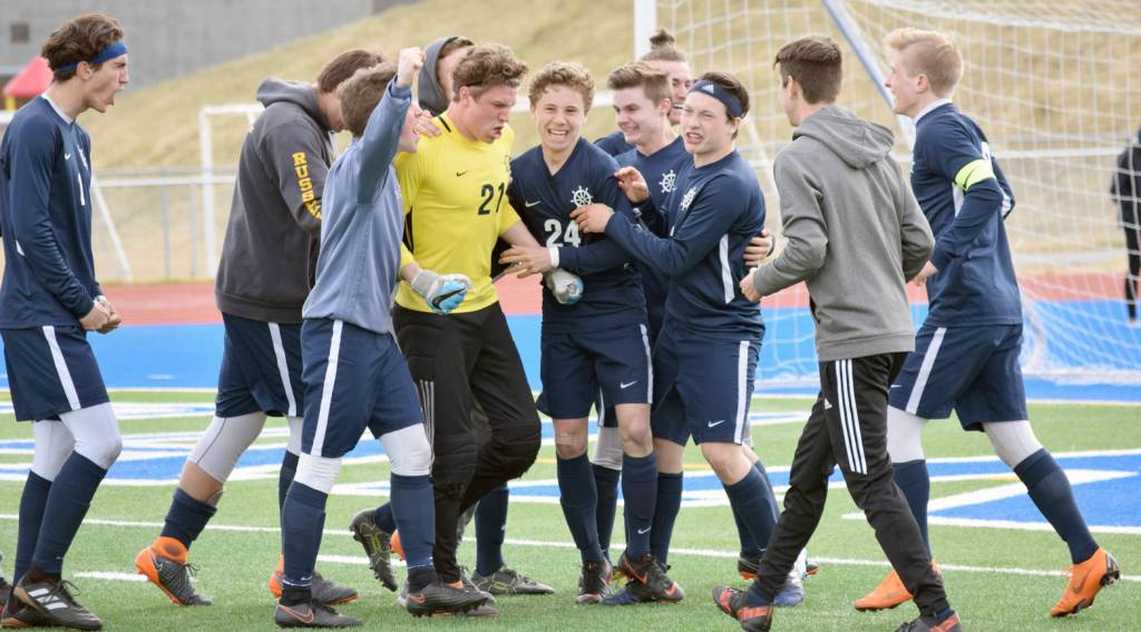 After 100 minutes of taut soccer, the penalty shootout was tied after the round of five at 5-all. The affair was finally decided in the first round of sudden-death penalty kicks when Homer’s Timothy Blakely drilled his shot past Soldotna goalie Cody Quelland, and Homer goalie Tucker Weston was able to step in front of Cameron Johnson’s attempt.