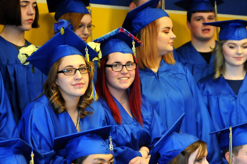 Larissa Pittman (left) and Laura Archuleta (right) wait to file in for the Kenai Alternative High School graduation ceremonty with their 23 classmates at the high school on Tuesday, May 22, 2018 in Kenai, Alaska. Kenai Alternative High School provides more flexible edcuation for students who struggled in traditional high school environments, scheduling classes around jobs, children and life circumstances to help students achieve their high school diplomas. (Photo by Elizabeth Earl/Peninsula Clarion)