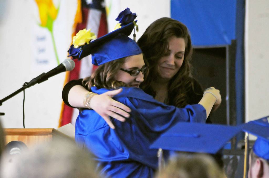 Kenai Alternative High School graduate Larissa Pittman hugs school secretary Jacquelynn Tomrdle at the high school’s graduation ceremony on Tuesday, May 22, 2018 in Kenai, Alaska. Kenai Alternative High School provides more flexible edcuation for students who struggled in traditional high school environments, scheduling classes around jobs, children and life circumstances to help students achieve their high school diplomas. (Photo by Elizabeth Earl/Peninsula Clarion)