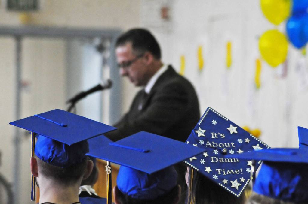 Kenai Alternative High School graduates listen as Principal Loren Reese speaks during their graduation ceremony on Tuesday, May 22, 2018 in Kenai, Alaska. Kenai Alternative High School provides more flexible edcuation for students who struggled in traditional high school environments, scheduling classes around jobs, children and life circumstances to help students achieve their high school diplomas. (Photo by Elizabeth Earl/Peninsula Clarion)