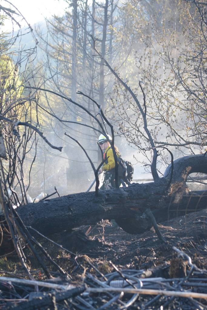 A resident of the area, Jack Allen, noticed black smoke, called 911 and began attacking the flames with a garden hose. Allen happened to be outside detailing his truck when he noticed black smoke from a neighbor’s yard two lots to the west. He called 911 and Soldotna dispatchers paged out Kachemak Emergency Services and Alaska Division of Forestry to respond from Basargin Road, where they had just begun mopping up a 3.1-acre wildland fire on Basargin Road off Mile 19 East End Road that had started about 4:40 p.m.