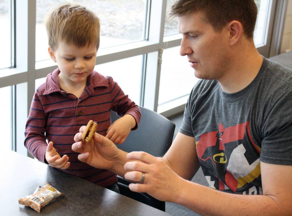 Kyle Downum brought three of his five children to the library Monday morning, and said having a ready-to-eat meal was a helpful bonus. “This really saved our bacon today.”