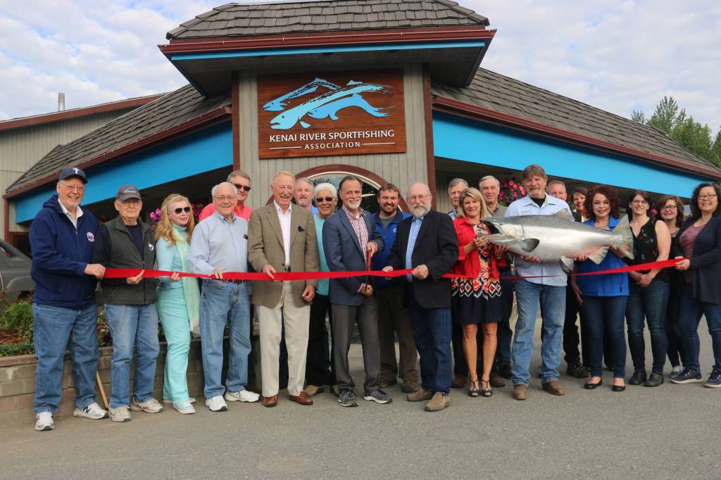 Board members and staff members of the Kenai River Sportfishing Association and Alaska Legislature delegates from the Kenai Peninsula gather to cut the ceremonial ribbon on the organization’s new office space on the Kenai Spur Highway next to Sweeney’s on Wednesday, June 13, 2018 in Soldotna, Alaska. The sportfishing advocacy nonprofit moved into the new space in March but held an open house and grand opening for the office Wednesday.