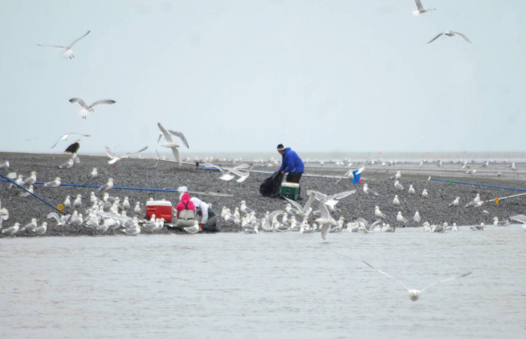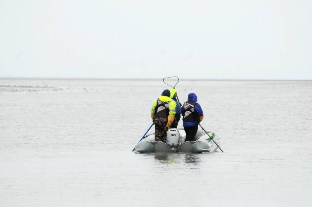 A few dipnetters dotted the north and south banks of the mouth of the Kasilof River on Wednesday morning around low tide, with a handful more in boats making passes up and down the estuary. Not many sockeye came out of the water, though anglers reported that they’d had more luck in the evenings before.