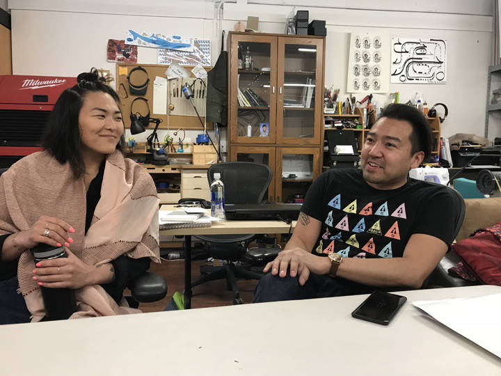 Eriksen, who joined Worl at the studio Tuesday, said her idea of lettering came from sitting down with Worl and figuring out how lettering could work with traditional formline art. She said the artwork is a symbol about the community.