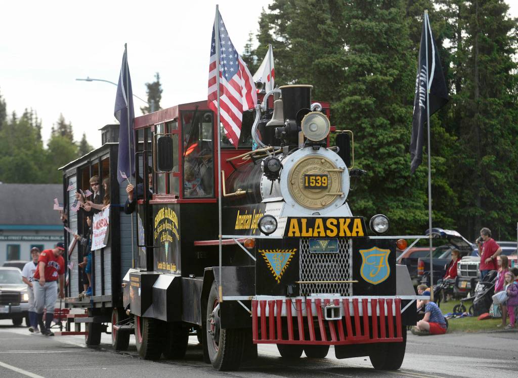 Kenai’s American Legion Post 20 drives their truck remodeled as a steam locomotive during Kenai’s Fourth of July parade on Wednesday, July 4, 2018 in Kenai, Alaska. Aboard are members of the Legion-sponsored Twins baseball team. (Ben Boettger/Peninsula Clarion)