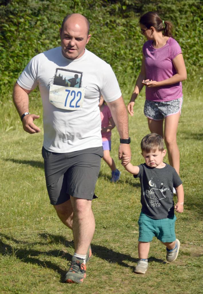 Jake Streich of Soldotna pushed his daughter, 3-year-old Harper, in a stroller for the entire 5K race. He still managed to finish ninth overall in 22:25.