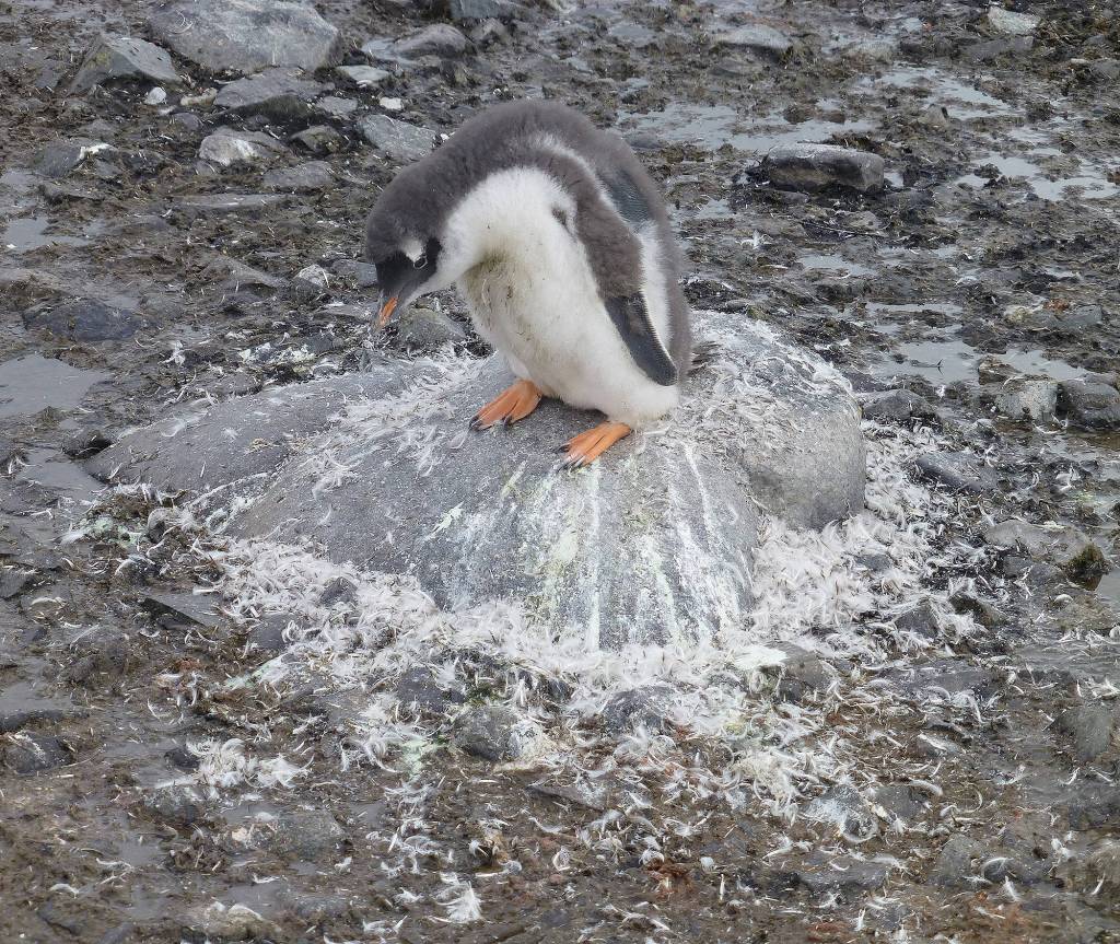 A snow-free, postglacial beach strewn with pebbles for making nests is paradise to a pair of breeding Gentoo penguins. With hordes of tottering birds going off to the ocean daily to catch krill and returning to land to feed little chicks, penguin poop in volume and stench is impressive. Based on a rough estimate, a colony of 500 Gentoo penguins would result in 3,000 pounds of poop each year. This rich contribution of marine-derived nutrients will slowly transform these rockscapes into coastal ribbons of algae and carpets of moss.