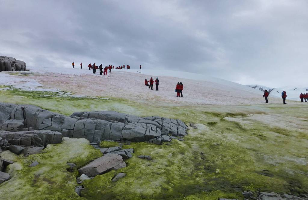 However, one brilliant researcher had thought ahead. Hannah, a PhD student from the University of Cambridge in the United Kingdom, packed a small microscope in among her extra socks, hats and gloves. When we hit Pleneau Island, she whipped out her portable WaterScope to exclamations of surprise and jealousy, and took a closer look at the pink- and green-tinged snow on the spot.