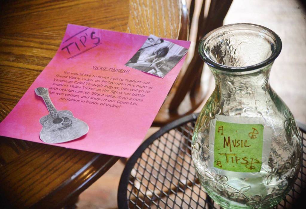 This Friday, Aug. 3, 2018 photo shows a tip jar at Veronica’s Cafe’s open mic event in Kenai, Alaska. Tips collected at open mic nights throughought August at Veronica’s Cafe will go to support community member, Vickie Tinker’s ovarian cancer treatment. (Photo by Victoria Petersen/Peninsula Clarion)