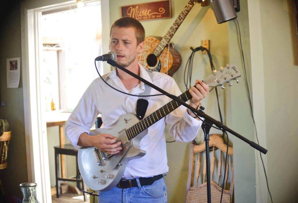 Ryan Hiller performs at Veronica’s Cafe for open mic night on Friday, Aug. 3, 2018, in Kenai, Alaska. Through the month of August, tips collected at Friday’s open mic nights from 6-8 p.m. will go to support community member, Vickie Tinker, who is fighting ovarian cancer. (Photo by Victoria Petersen/Peninsula Clarion)