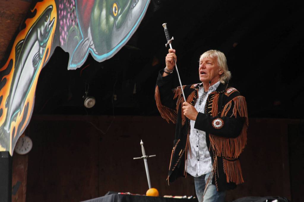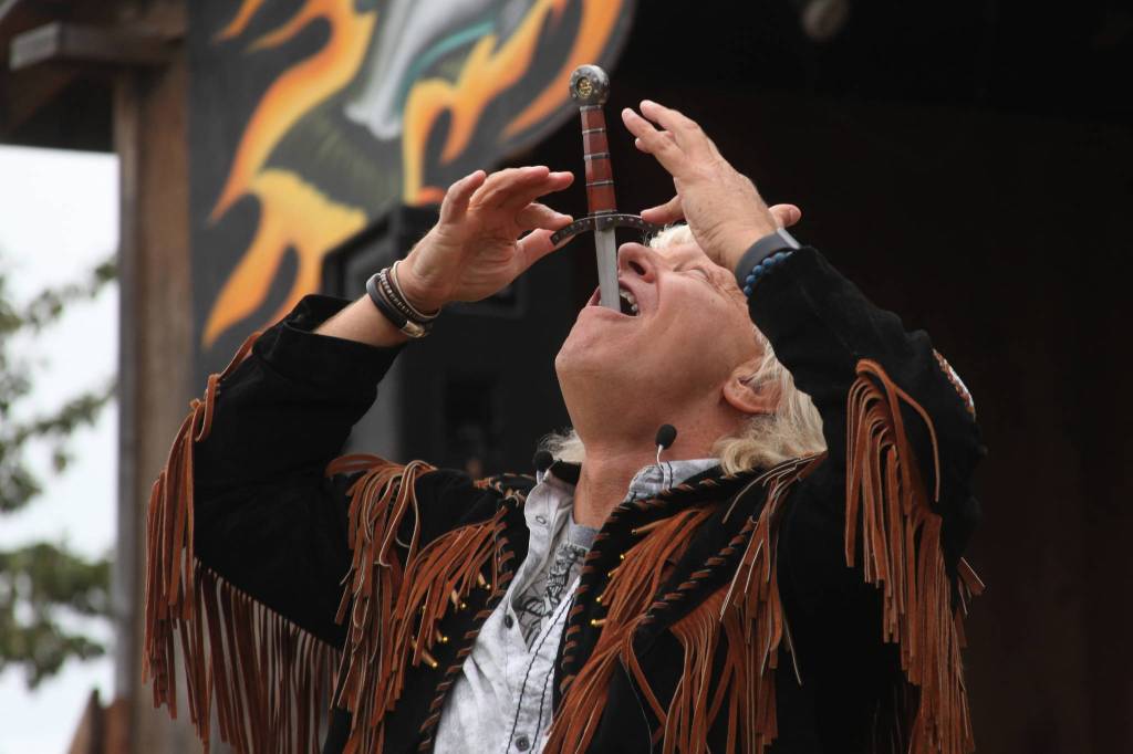 He found himself at the Kenai Peninsula Fair in Ninilchik this weekend as a side trip connected with his upcoming performances at the Alaska State Fair in Palmer from Aug. 23–Sept. 3. Despite the rain, a crowd gathered before the stage to watch as he paced through a routine, gradually swallowing larger and larger blades, including a pair of hedge clippers and a large straight razor.