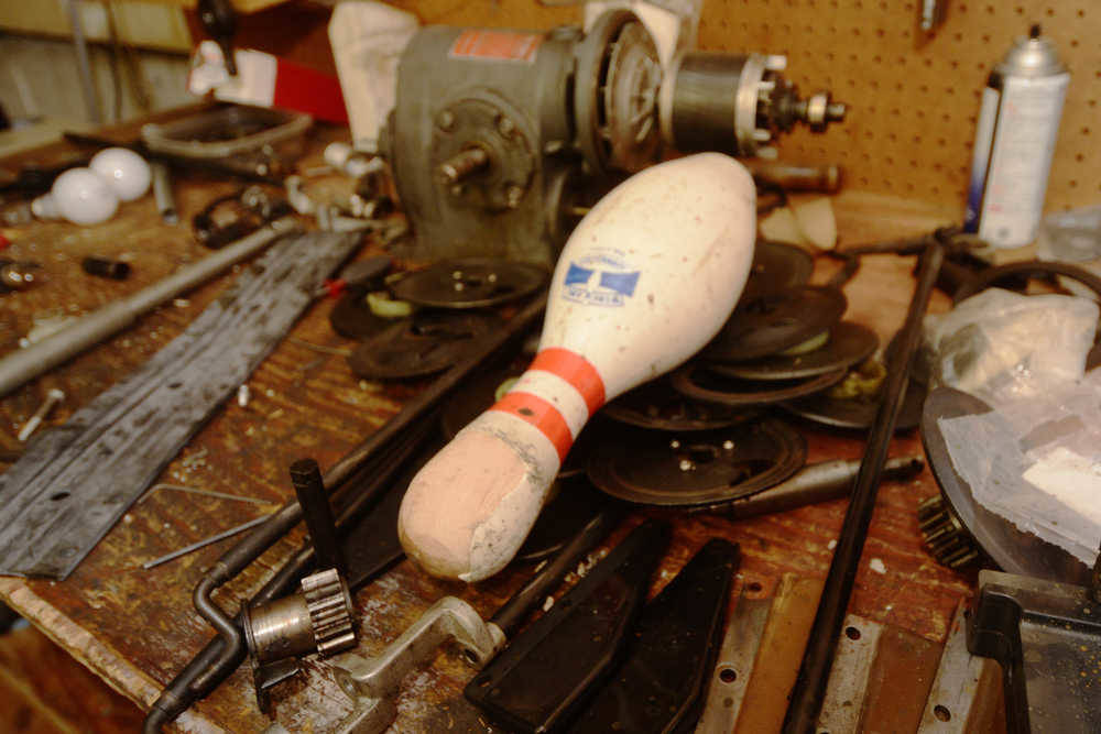 A broken pin sits on a workbench in the backroom of the Kenai bowling on Saturday, Nov. 14 in Kenai. The bowling alley is now owned by the city of Kenai, which will soon begin seeking management for it. (Ben Boettger/Peninsula Clarion)