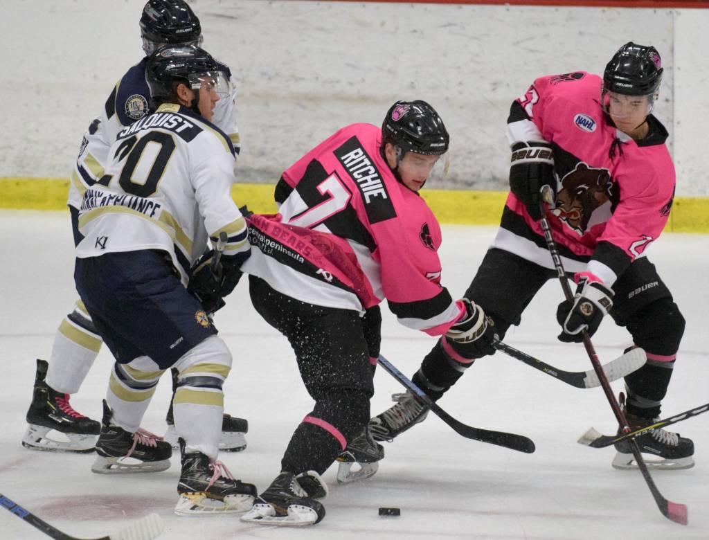 After falling behind by a goal in the first period, the Bears drew even 5 minutes, 49 seconds, into the second period when Ryan Reid had his first career NAHL goal by beating Cole Brady high and stick side. Trevor Schroder and Porter Schachle assisted.