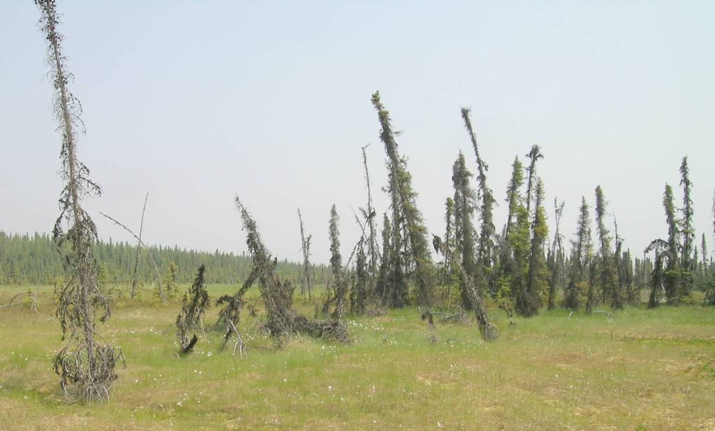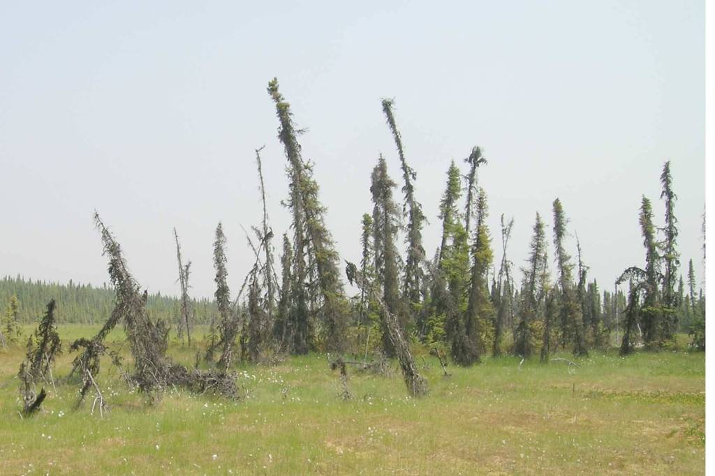 A telltale sign of thawing permafrost plateaus is when black spruce growing in the overlying soil starts to tilt, eventually to fall over. (Photo by Ed Berg)