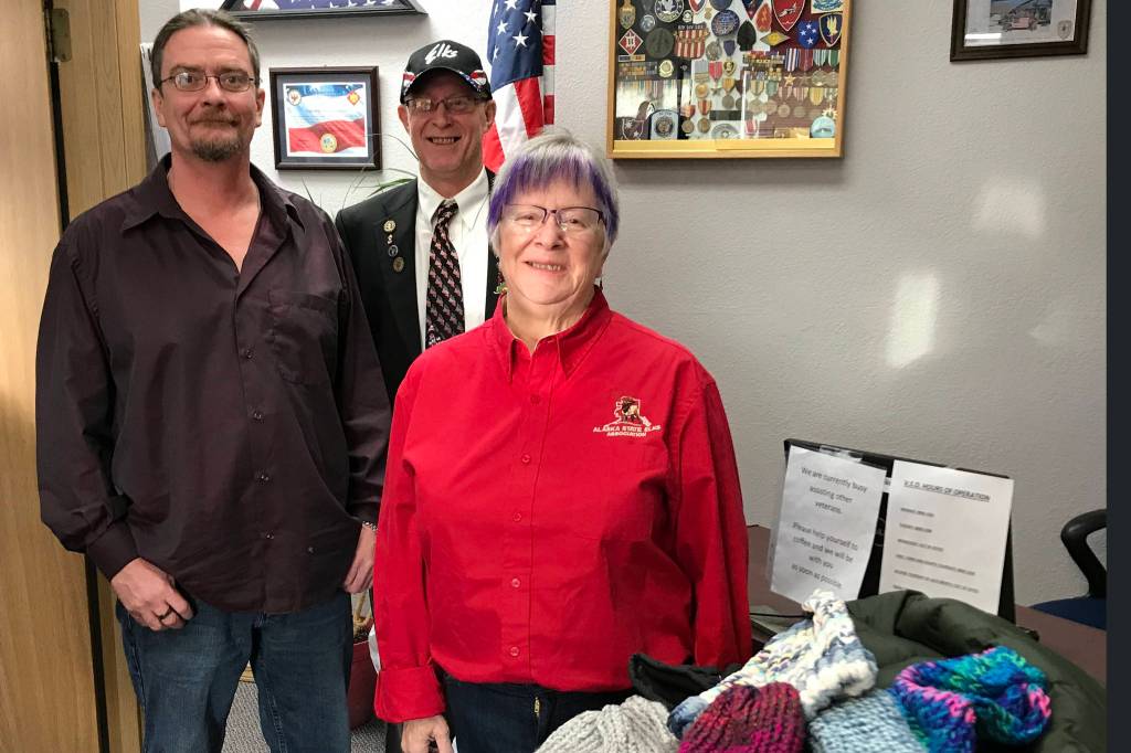 Kenai Elks Lodge Exalted Ruler Ken Cole and Kenai Elks Lodge Member Marti Slater present donated winter items to the Ronald Engebretson of the Kenai Vet Center on Wednesday in Kenai. (Courtesy photo)