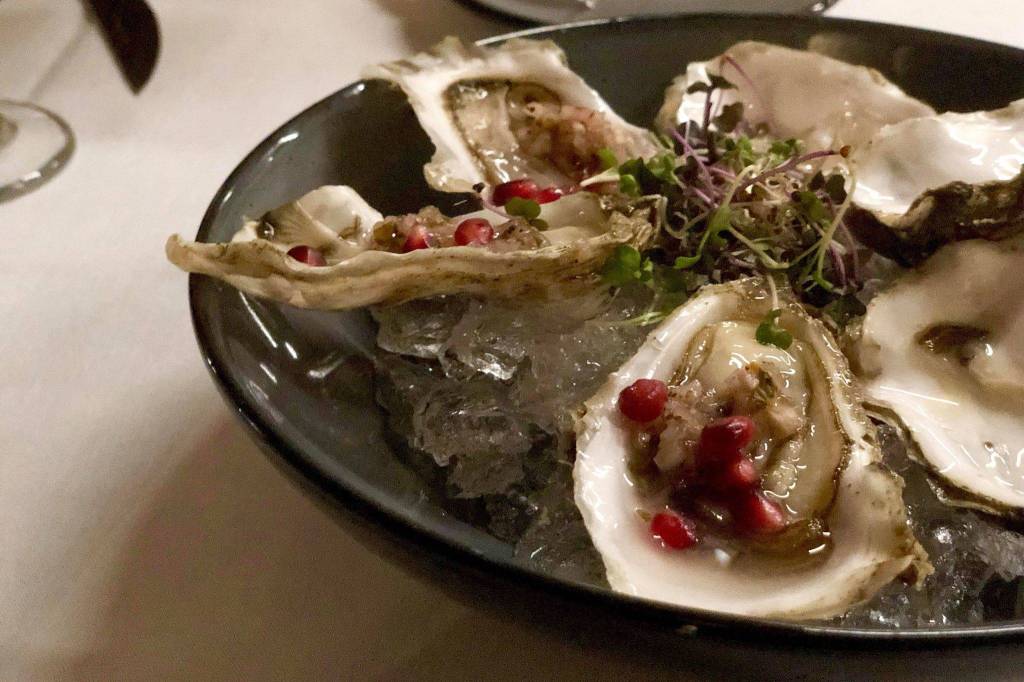 Addie Camp Train Eatery and Wine Bar strives to feature local food on their menu as much as possible, like oysters from Jacalof Bay, on Monday, Dec. 31, 2018, in Soldotna, Alaska. (Photo by Victoria Petersen/Peninsula Clarion)