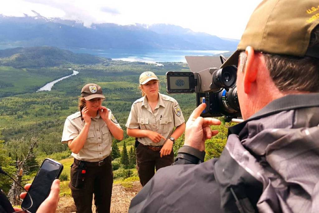 Laura Bashor and Amber Robbins, two biological interns at the Kenai National Wildlife Refuge, being filmed this past summer for an Animal Planet series on top of Hideout Trail. (Photo provided by refuge)