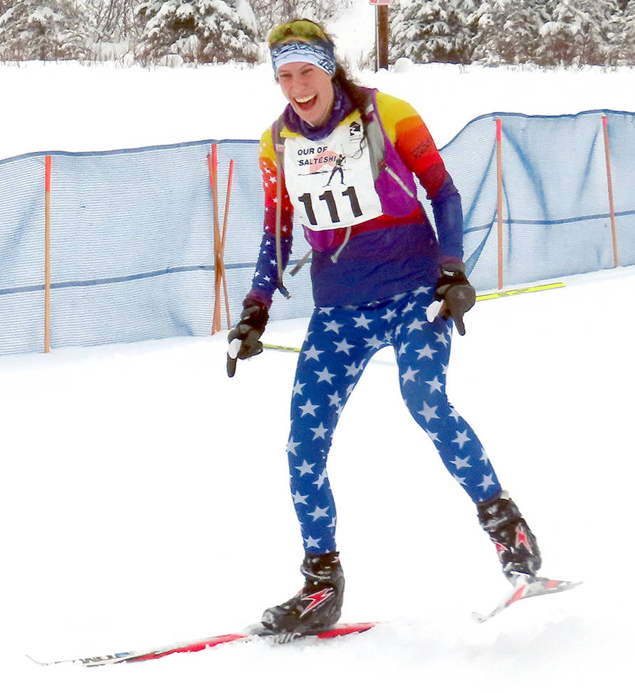 She expected a group of over 10 of her students, but some couldn’t make it due to the roads. One who did is Tara Schmidt, who was third in 3:34:59. Schmidt broke a ski in a fall near the start and came back to the starting area, rounding up another ski, before completing the race.