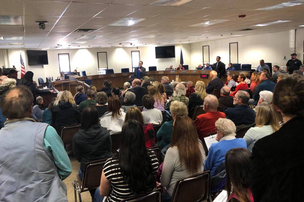 Hundreds of peninsula residents squeezed into the Kenai Peninsula Borough Betty J. Glick Assembly Chambers to attend a town hall with Sen. Peter Micciche, R-Kenai/Soldotna, and Rep. Ben Carpenter, R-Nikiski. Many residents spoke against the governor’s proposed cuts to education, while some residents supported the administration’s plan to reduce government spending.