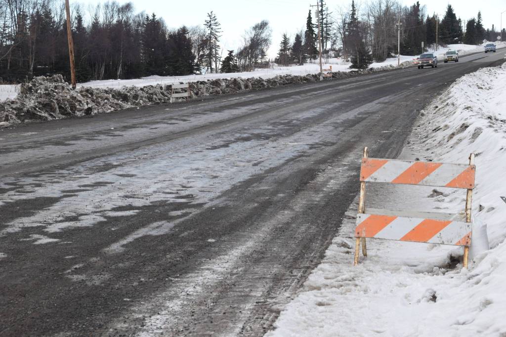 The section of unpaved road on the Kenai Spur Highway heading into Nikiski, as seen on Feb. 26, 2019. (Photo by Brian Mazurek/Peninsula Clarion)