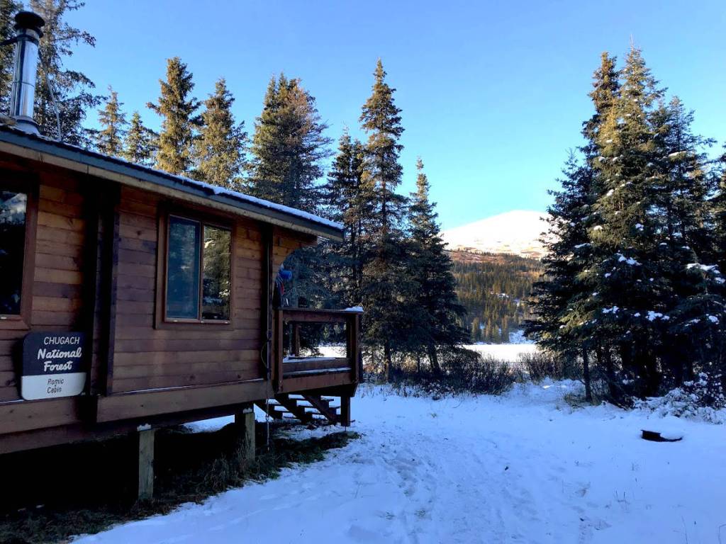 Romig Cabin, a public-use cabin on Juneau Lake, is seen here in November 2017. The cabin can be rented online at recreation.gov and can be accesed by hiking, biking, skiing and horseback. (Photo by Kat Sorensen/Peninsula Clarion)