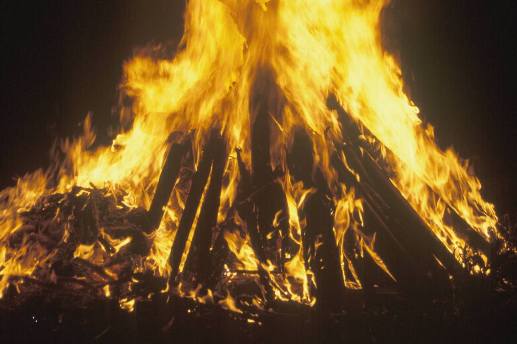 The day of St. Patrick’s arrived and Bob hauled some pallets he had found and placed them in the fire pit and then stacked odd pieces of wood on top. He hauled out his big “weed burner” (as I call it) — and poof, we had a roaring fire.