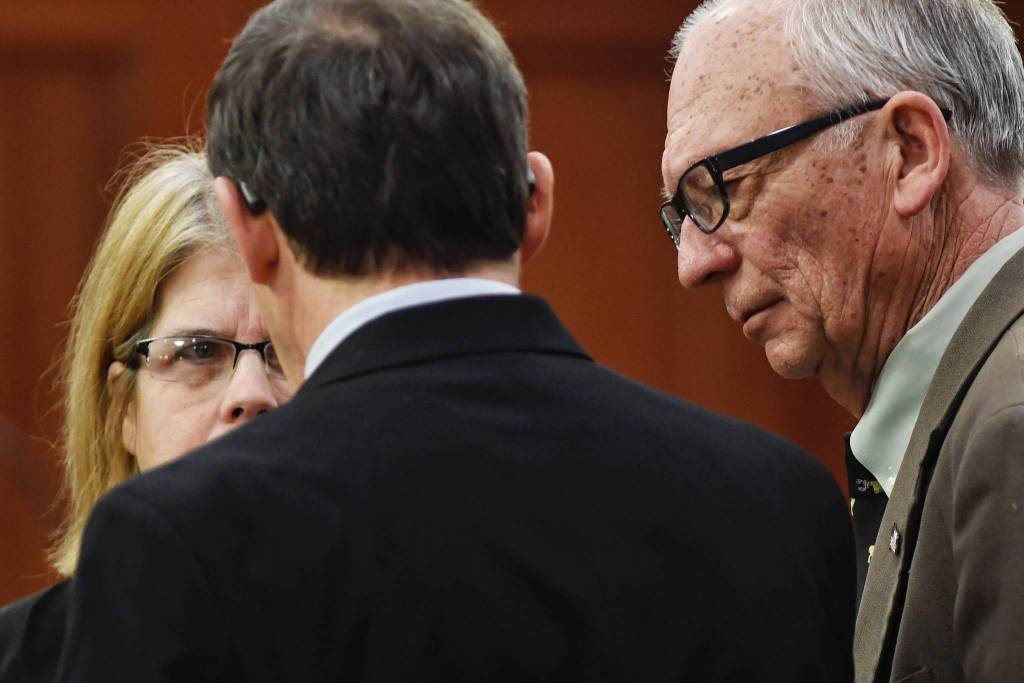 Rep. Tammie Wilson, R-North Pole, left, speaks with Rep. George Rauscher, R-Anchorage, center, and Rep. Steve Thompson, R-Fairbanks, on the House floor as amendments to the budget are proposed on Tuesday, April 9, 2019. (Michael Penn | Juneau Empire)