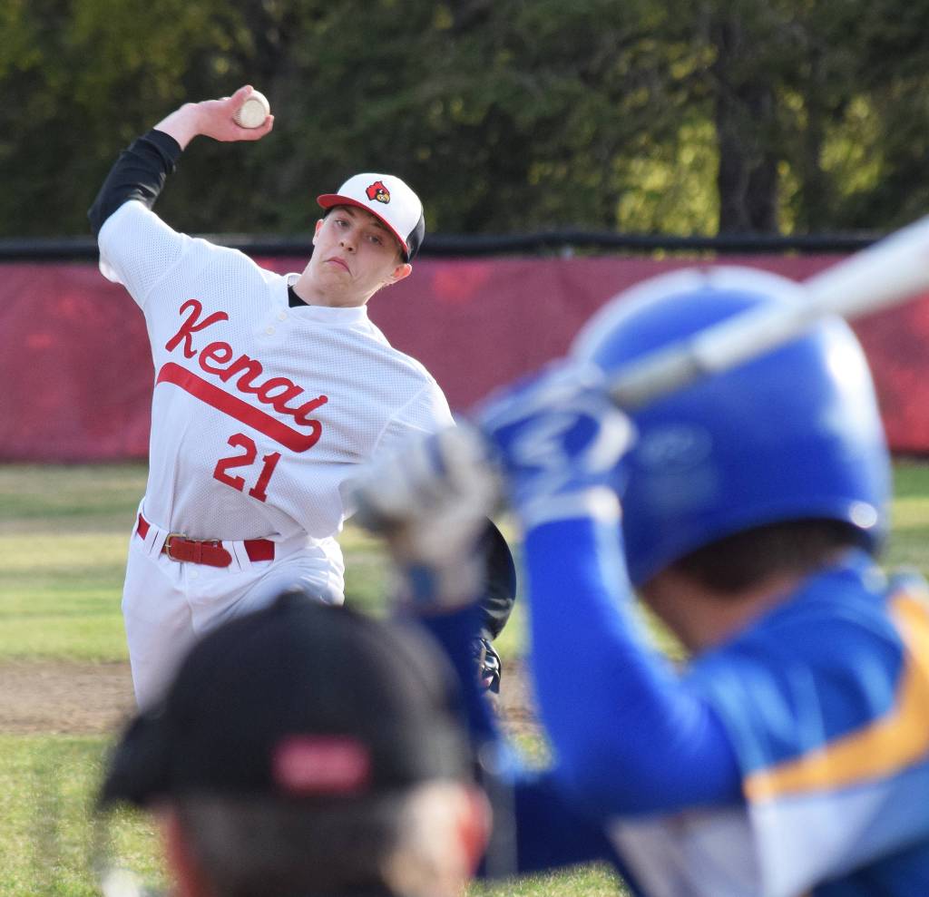 Kenai’s Harold Ochea offers up a pitch to Kodiak batter Paul Winegart Thursday, May 16, 2019, at the Kenai Little League Fields in Kenai, Alaska. (Photo by Joey Klecka/Peninsula Clarion)