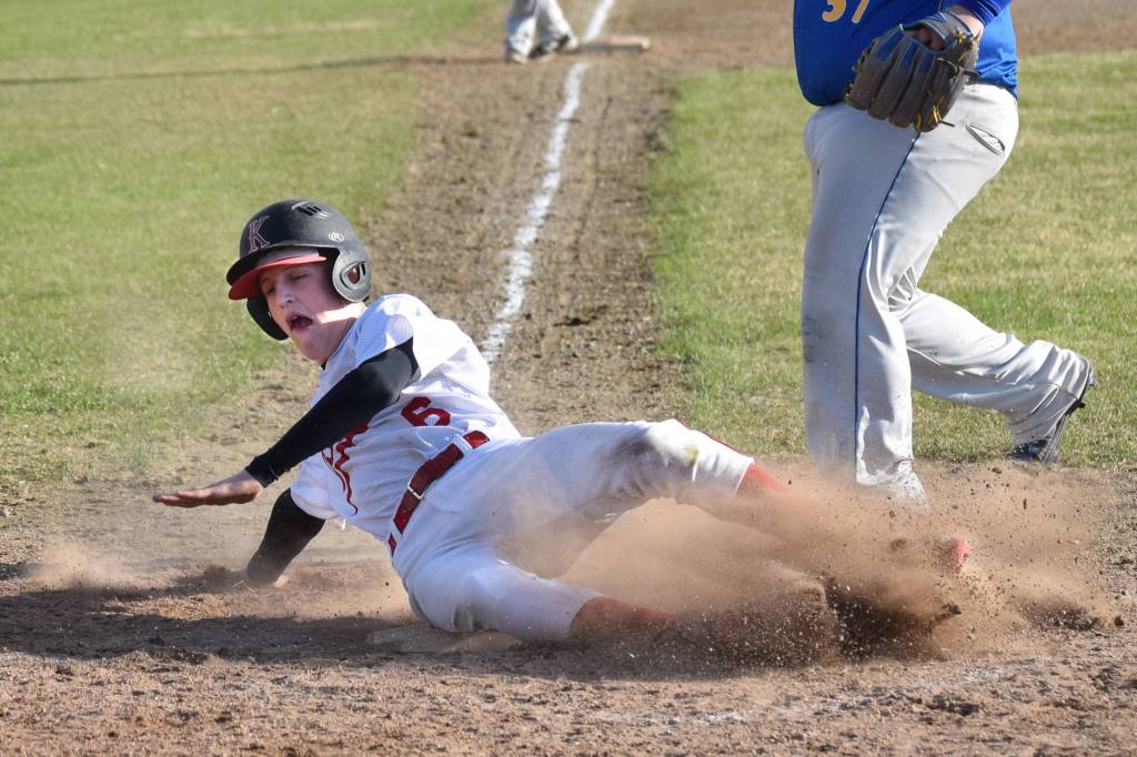 Kenai’s Jaryn Zoda slides home safely in a conference game against Kodiak Thursday, May 16, 2019, at the Kenai Little League Fields in Kenai, Alaska. (Photo by Joey Klecka/Peninsula Clarion)