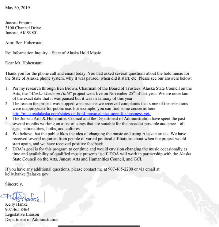 The music’s return was announced via a May 17 press release, and when it came back a pair of songs — “Flicker of Light” by Whiskey Class and “Mother Carries” by Harm — were no longer on the list of hold music. One new selection, “Bravura Variations on Alaska’s Flag Song” by Paul Rosenthal, is now part of the lineup.