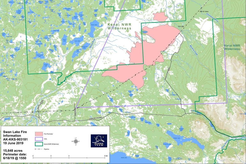 Five crews from the Lower 48 will be arriving in Alaska today to assist in the management of the Swan Lake Fire. The fire, which was started by a lightning strike in the Kenai National Wildlife Refuge northeast of Sterling on June 5, has reached 15,648 acres as of Tuesday afternoon, according to a June 19 update from Alaska Interagency Incident Management Team.