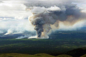 A smoke column on the northeast side of the Swan Lake Fire as seen on June 17, 2019. (Photo by Casey Lasota/Alaska Division of Forestry)