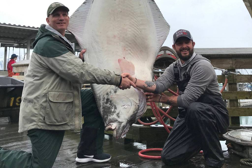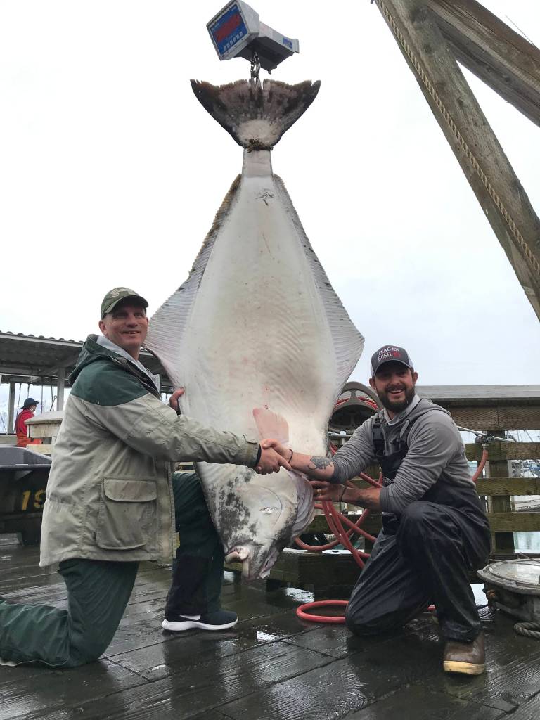 The winning fish in this year’s halibut tournament was reeled in by Guy Minske, left, and weighed 257.8 pounds. (Photo submitted by Seward Chamber of Commerce)