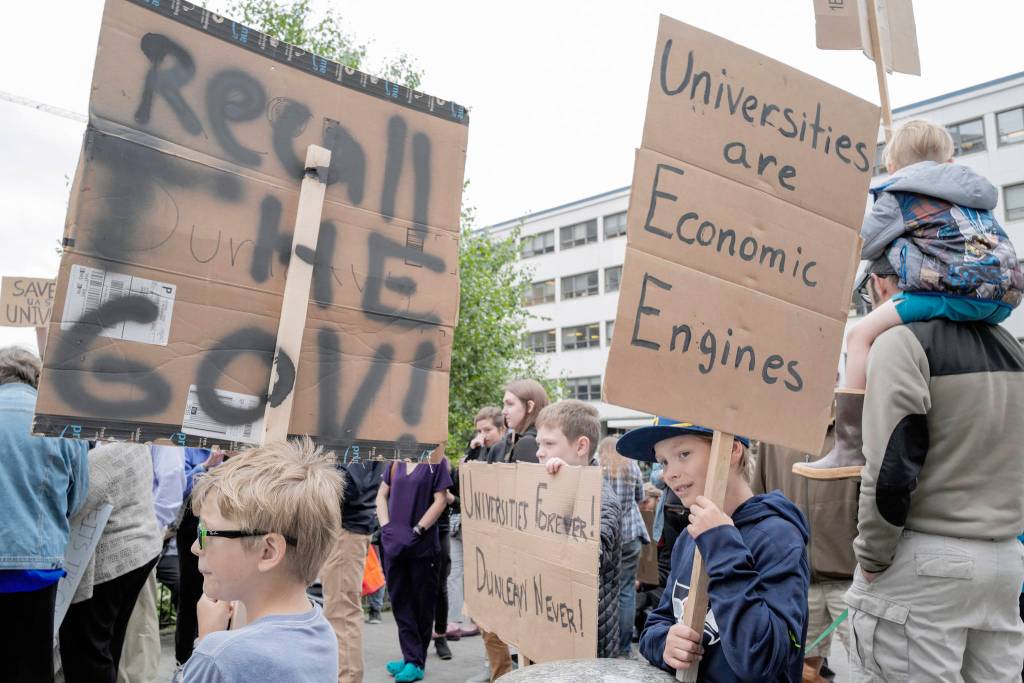 About 200 protesters gathered across from the Alaska State Capitol at noon Friday, and took the short walk to the governor’s mansion chanting, singing and clapping, voicing their anger at Gov. Mike Dunleavy and the $444 million in cuts to the state budget.