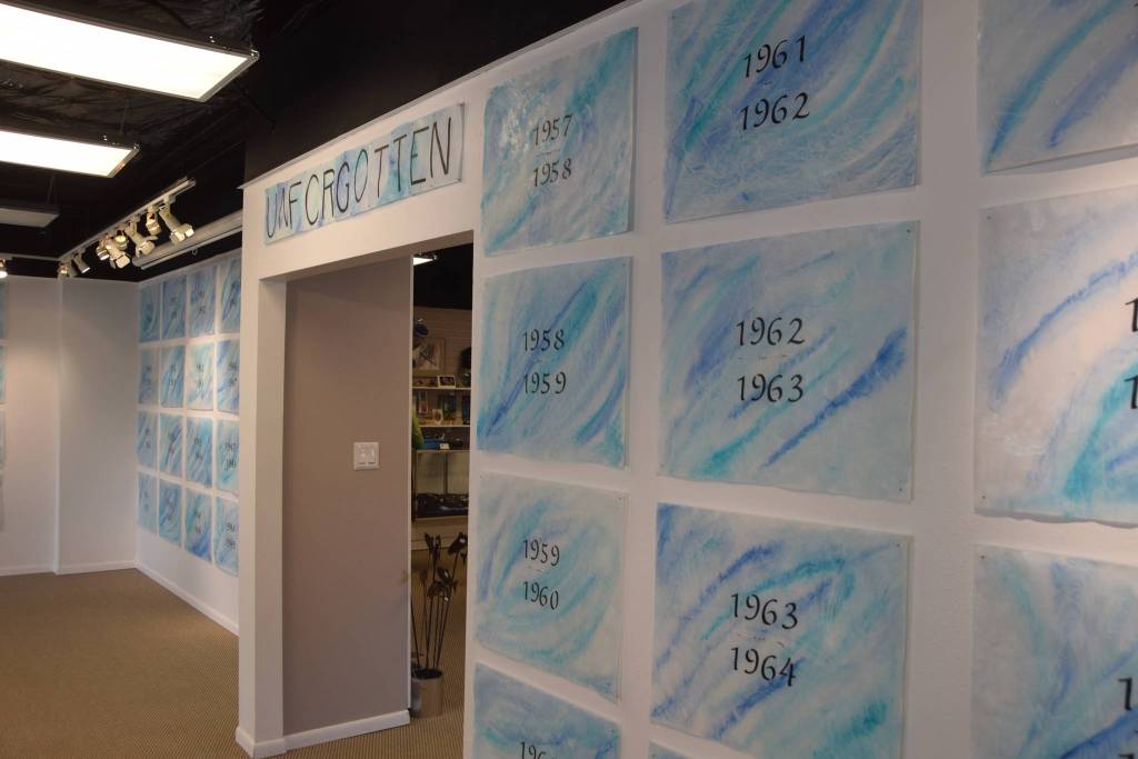 For this installation, Isaak took a break from his usual medium of bronze statuary casting. “Unforgotten” is a series of 134 watercolor paintings dipped in wax and colored with light blue hues that have a translucent, marble texture. Each piece features two years written in ink and separated by porcupine quills and glass beads, and the dates run from 1885 to 2019.