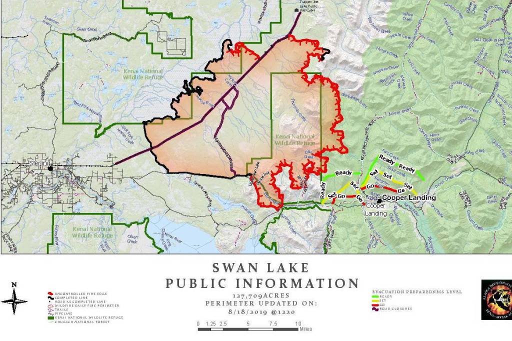 The Swan Lake Fire was 5 miles to the west and northwest of Cooper Landing, according to the latest update provided by the Office of Emergency Management.