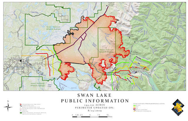 The updated Swan Lake Fire Map for Friday, Aug. 23, 2019, in Kenai, Alaska. (Photo courtesy of the Kenai Peninsula Borough Office of Emergency Management)