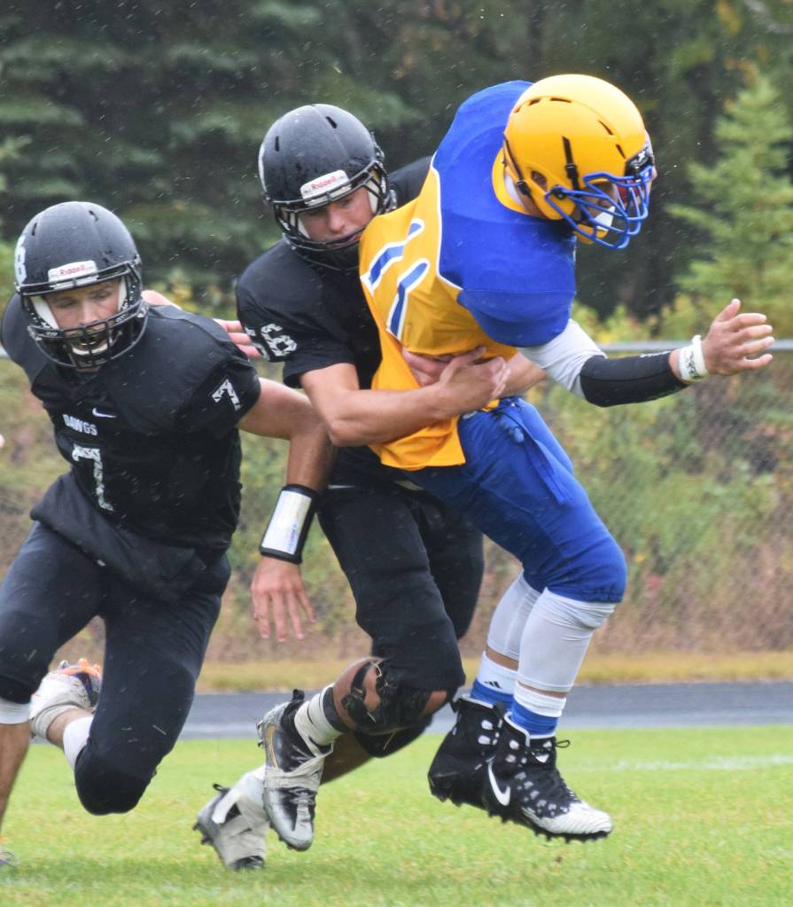 Nikiski’s Caileb Payne (left) wraps up Barrow running back Ervin Feleti for a tackle Saturday, Sept. 7, 2019, in Nikiski, Alaska. (Photo by Joey Klecka/Peninsula Clarion)