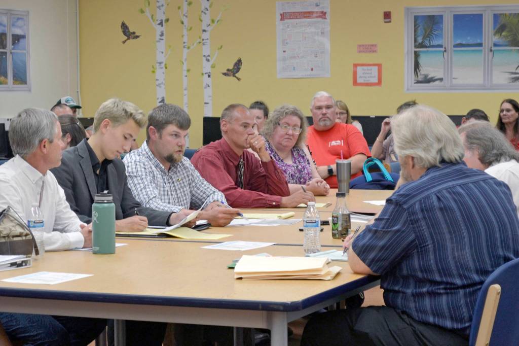 The Kenai Peninsula Borough School District and two employee associations — The Kenai Peninsula Borough Education Association and the Kenai Peninsula Borough Education Support Association — negotiate for a new contract on Tuesday, Aug. 13, 2019, at the Soldotna High School Library, in Soldotna, Alaska. (Photo by Victoria Petersen/Peninsula Clarion)