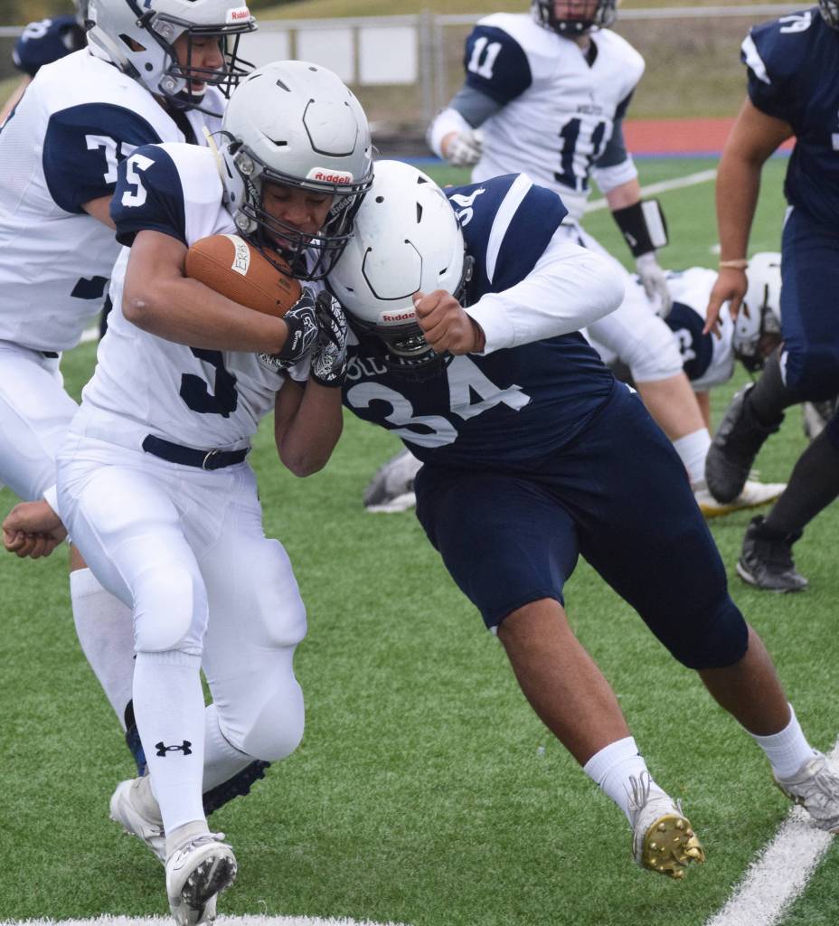 Soldotna’s Jersey Truesdell (bottom) tackles Eagle River’s Cashiez Reaves, Saturday, Sept. 28, 2019, against Eagle River at Justin Maile Field in Soldotna. (Photo by Joey Klecka/Peninsula Clarion)