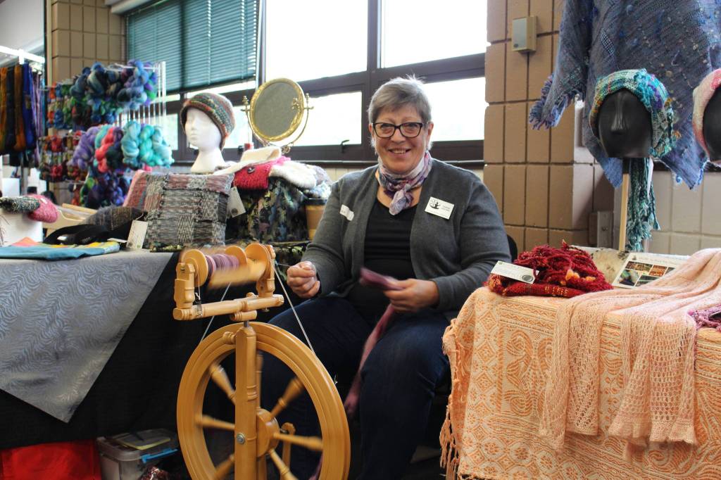 Sharon Koecher sits at her spinning wheel and shows off her wares during the Fireweed FiberFest at the Soldotna Regional Sports Complex in Soldotna, Alaska on Sept. 28, 2019. (Photo by Brian Mazurek/Peninsula Clarion)