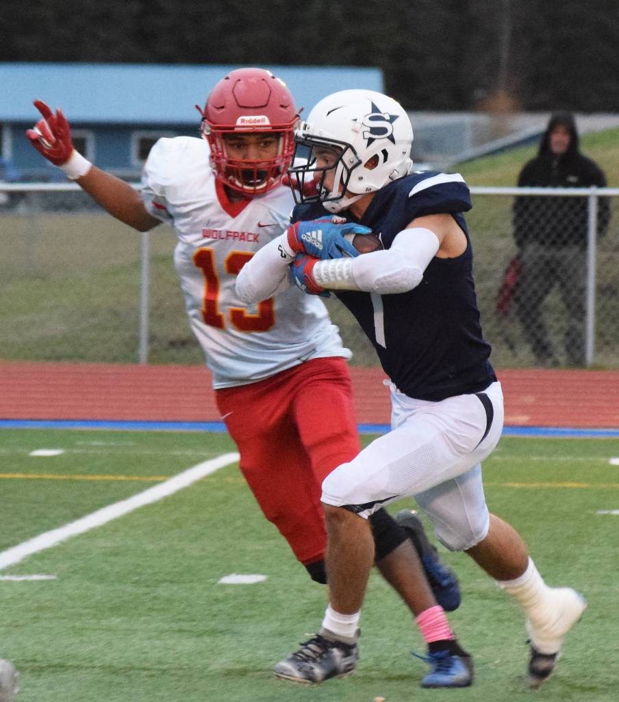 Soldotna (8-0) was led by senior Aaron Faletoi, who scored three touchdowns in the first half for the Stars and finished with 87 rushing yards. Hudson Metcalf and Wyatt Medcoff both scored twice on the ground, and Medcoff recorded a game-high 146 rush yards.
