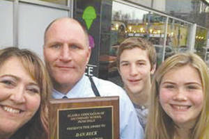 Dan Beck, center, Alaska assistant principal of the year, poses with his award in this undated photo. (Photo courtesy of Kenai Peninsula Borough School District)