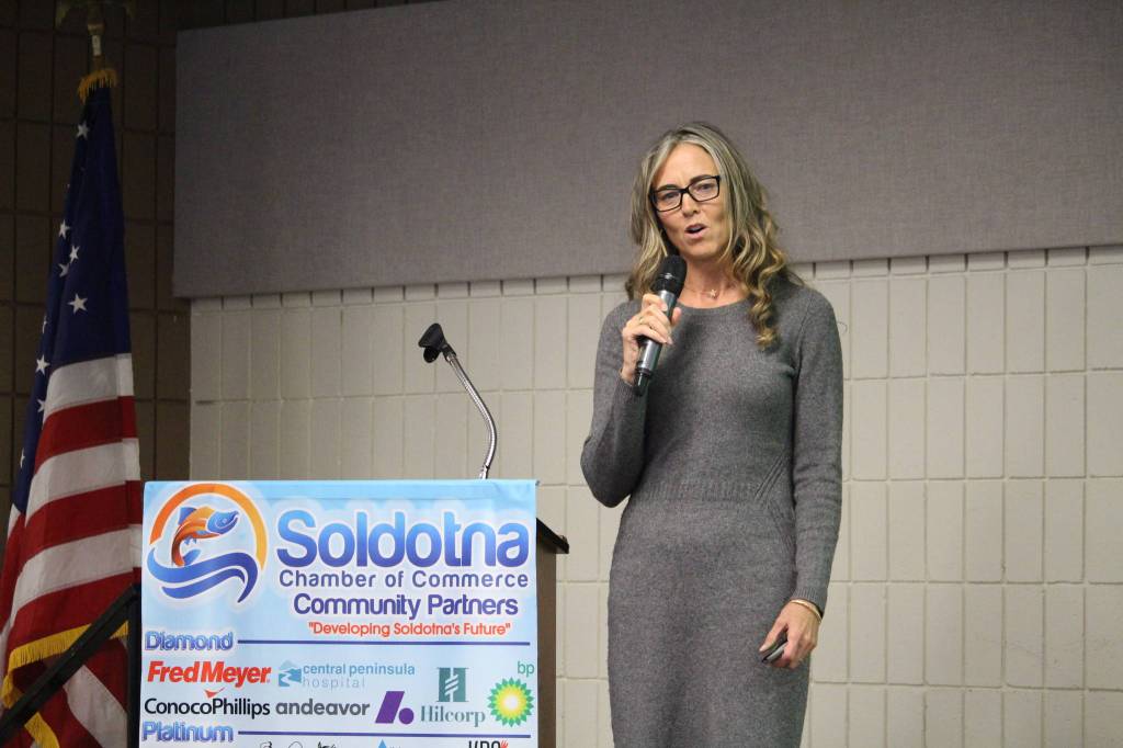 Dr. Kelly Olson, Associate Director of Clinical Affairs for Millennium Health, gives a presentation to the Kenai and Soldotna Chambers of Commerce at the Soldotna Regional Sports Complex on Wednesday, Nov. 13, 2019. (Photo by Brian Mazurek/Peninsula Clarion)