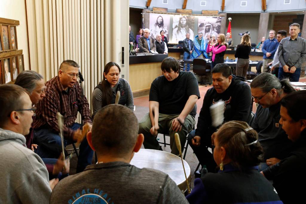 Drummers perform during a Confederated Salish and Kootenai Tribes council meeting attended by Attorney General William Barr, Friday, Nov. 22, 2019, on the Flathead Reservation in Pablo, Mont. (AP Photo/Patrick Semansky)