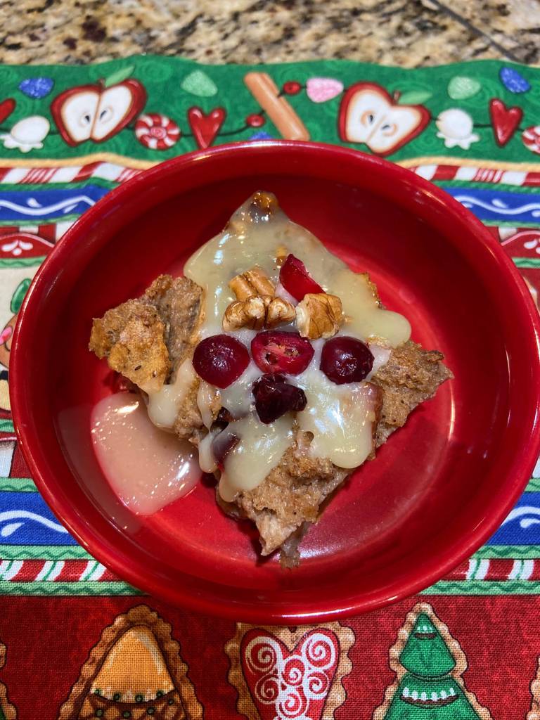 Cranberry amaretto bread pudding can be a festive way to end a holiday meal. Teri Robl made this recipe on Nov. 26, 2019, in her Homer, Alaska, kitchen. (Photo by Teri Robl)