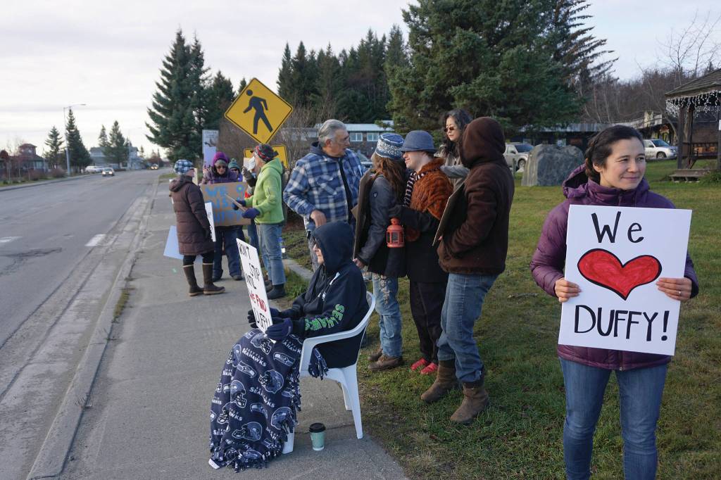 Organizer Shelby Sinn held a sign that said “We (heart) Duffy.” Others held signs that said “Duffy Plz Come Back,” “Help Duffy Home” and “Bring Duffy Home.”