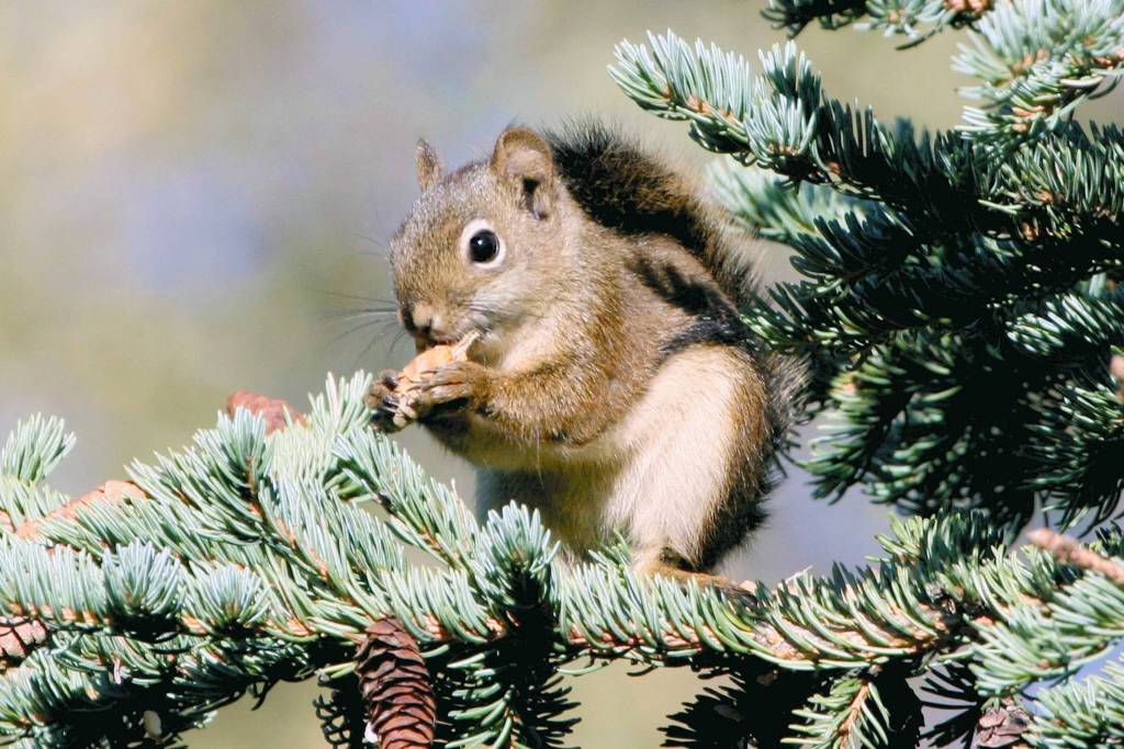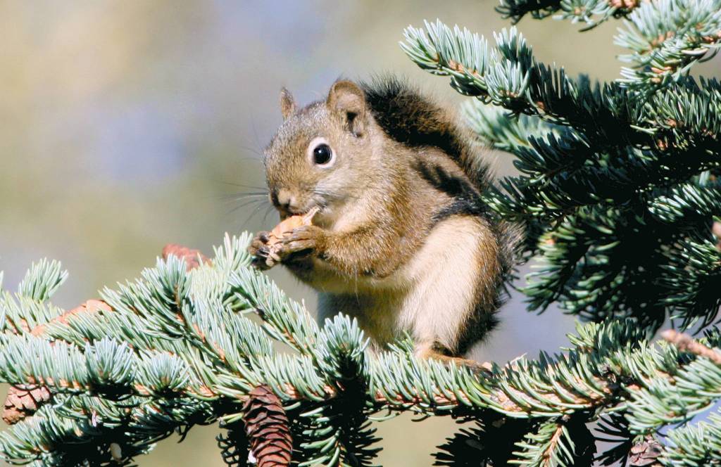 Though they are omnivorous and eat a variety of foods like mushrooms, insects or bird eggs, red squirrels primarily eat conifer seeds. The seeds from white spruce cones are tiny. One squirrel can eat the seeds from over 100 spruce cones a day.